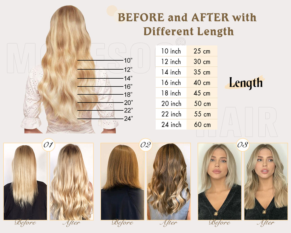 Before and after 18 inch tape hair extensions above is a perfect before and after example of the makeover an 80 piece hheo 18 inch tape hair extension set could give you. Our tape-in extensions are available in all the lengths we offer at ZALA. 14 INCHES SEW IN EXTENSIONS.